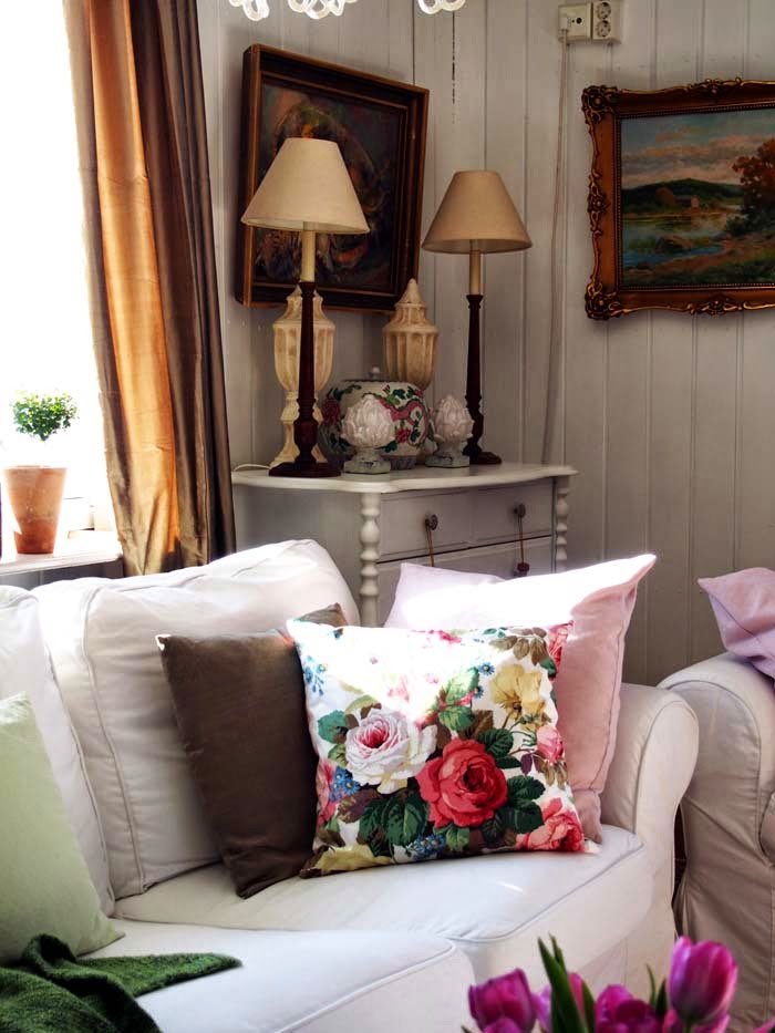 Ompelin vanhoista verhoista keväiset sohvatyynyt.Kuvat: Keltainen talo rannalla